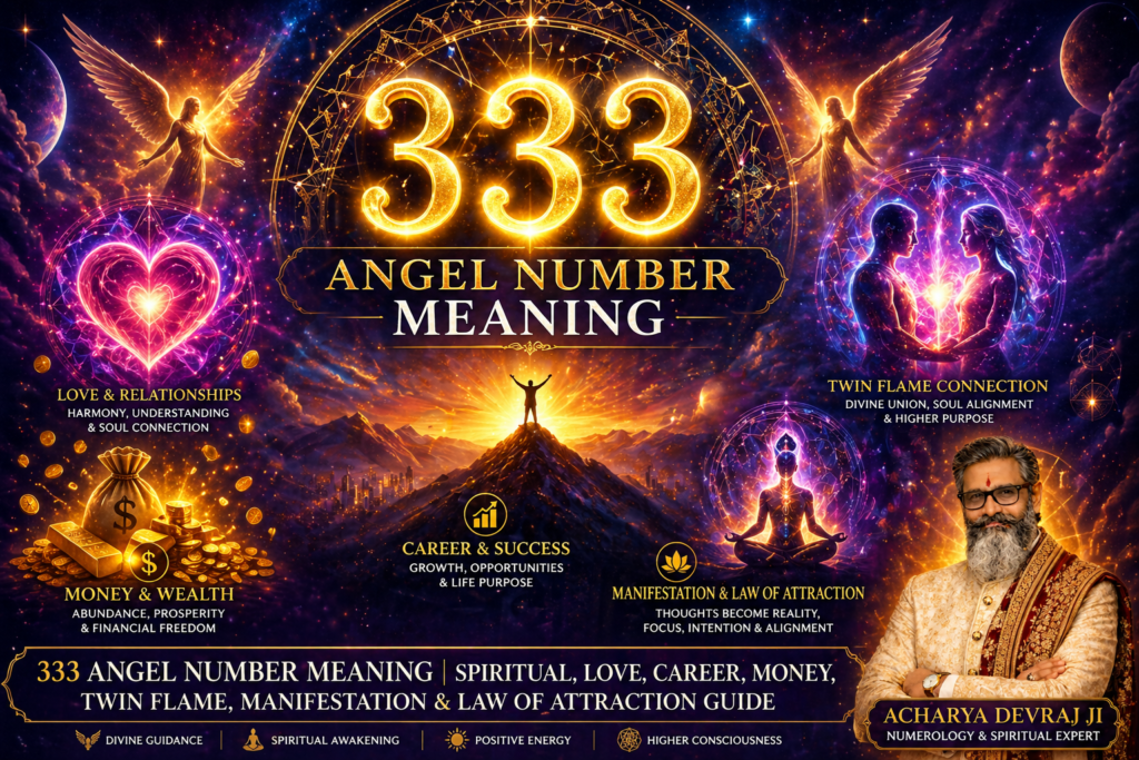 Learn 333 angel number meaning for love, career, money, twin flame, and manifestation. Discover what 333 means spiritually and in law of attraction with Numerology Expert Acharya Devraj Ji.