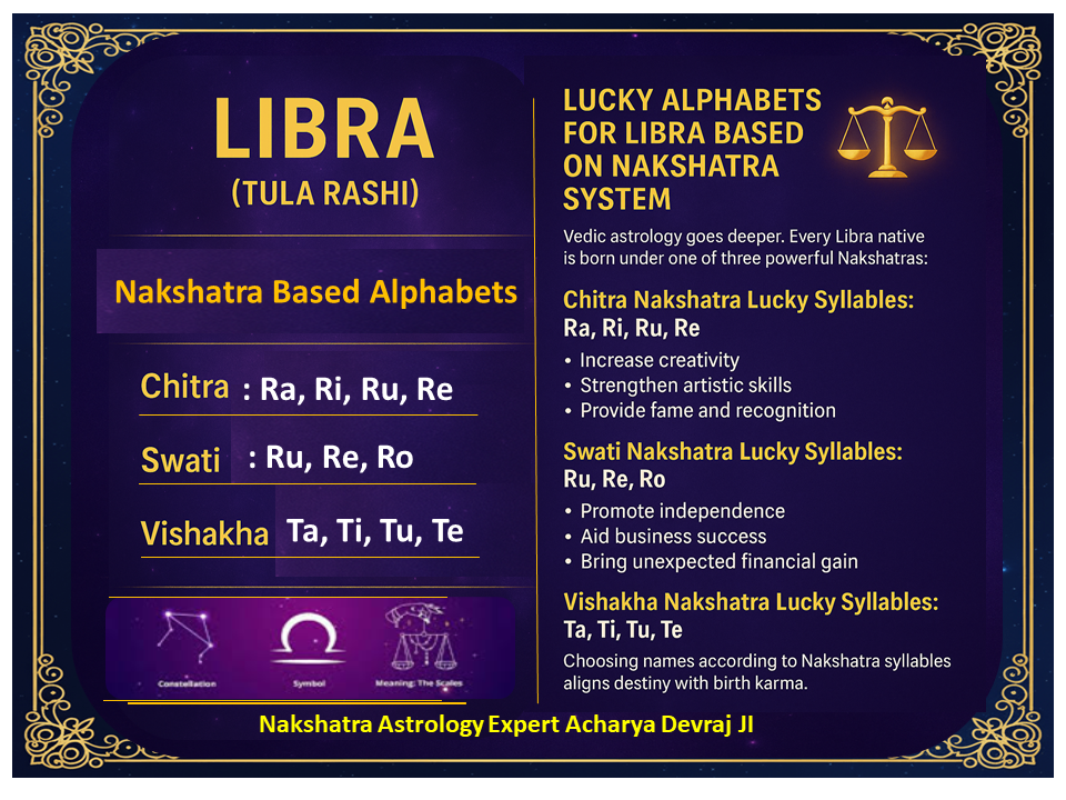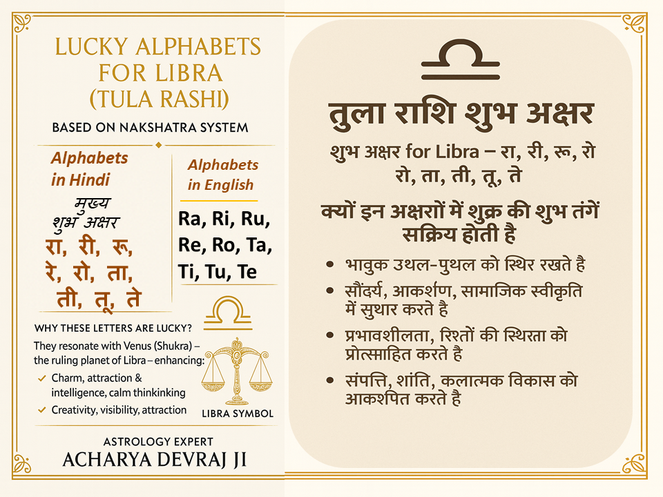 After analyzing thousands of charts, karmic patterns, and name vibrations, Acharya Devraj Ji identifies the following alphabets as the most beneficial for Libra natives: