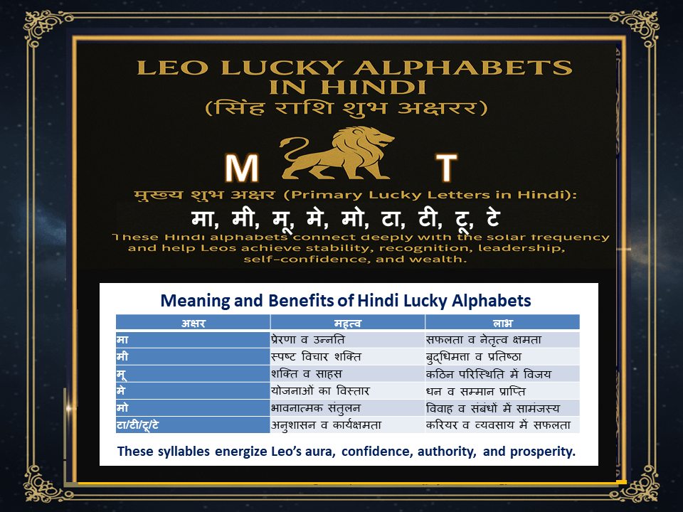 Lucky alphabets are powerful tools for Leo individuals seeking growth, stability, wealth, love, fame, and spiritual alignment. The primary alphabets M and T, supportive letters A, H, S, Y, and Hindi syllables मा, मी, मू, मे, मो, टा, टी, टू, टे tune the person to the Sun’s powerful vibration. When used strategically—in personal names, business branding, baby names, and signature identity—they help Leo natives unlock hidden potential and achieve success effortlessly.