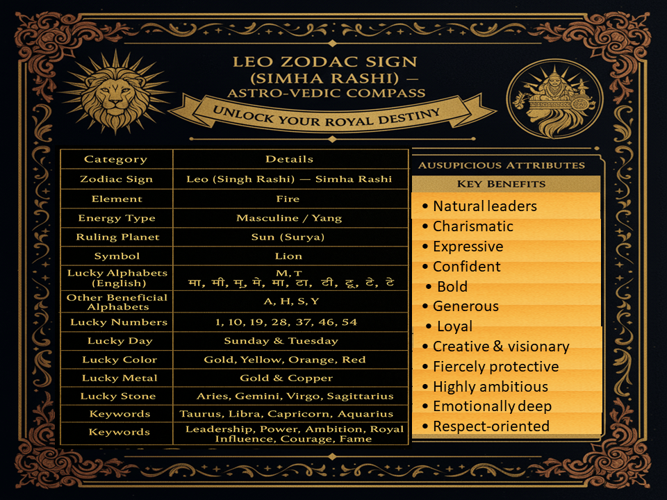 Lucky alphabets influence Leo’s personality, destiny, relationships, and financial future in powerful ways. Since Leo is ruled by the Sun (Surya), the strongest planetary energy in Vedic astrology, their lucky alphabets resonate with themes of power, authority, leadership, influence, and prestige. When a Leo’s name carries the correct sound vibration, it activates the Sun’s blessings and helps them achieve their full potential.