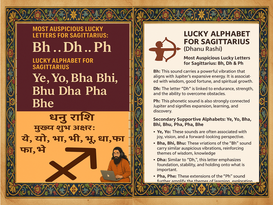 Indeed, for Dhanu Rashi (Sagittarius), lucky Hindi alphabets include ये (Ye), यो (Yo), भा (Bha), भी (Bhi), भू (Bhu), ध (Dha), फा (Pha), and भे (Bhe). These carry vibrations that support wisdom, exploration, and good fortune.