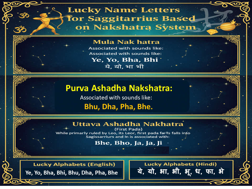 The Nakshatra system provides a more precise guide. For Sagittarius natives, depending on their specific Nakshatra (Mula, Purva Ashadha, Uttara Ashadha), certain phonetic sounds (Padas) are considered highly auspicious. For instance, Mula Nakshatra is associated with sounds like Ye, Yo, Bha, Bhi.