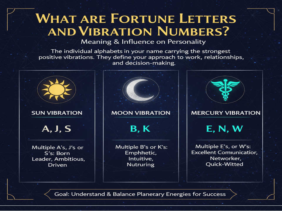 Your Fortune Letters are the individual alphabets in your name that carry the strongest positive vibrations. They define your approach to work, relationships, and decision-making.