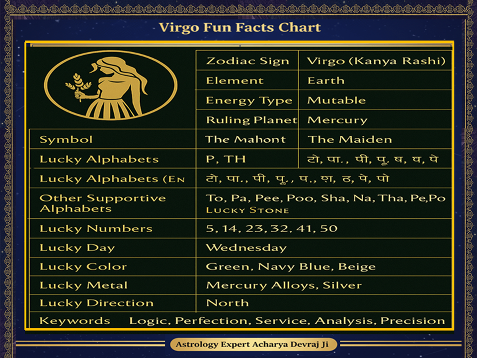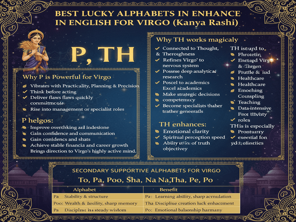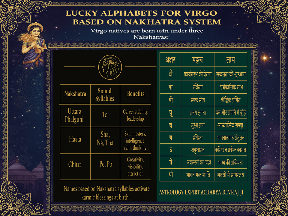 Discover the lucky alphabets for Virgo (Kanya Rashi) to enhance success in career, relationships, business, and personal growth. Learn why letters like P and TH unlock Mercury’s power and transform destiny with expert name-vibration insights from renowned astrologer Acharya Devraj Ji.